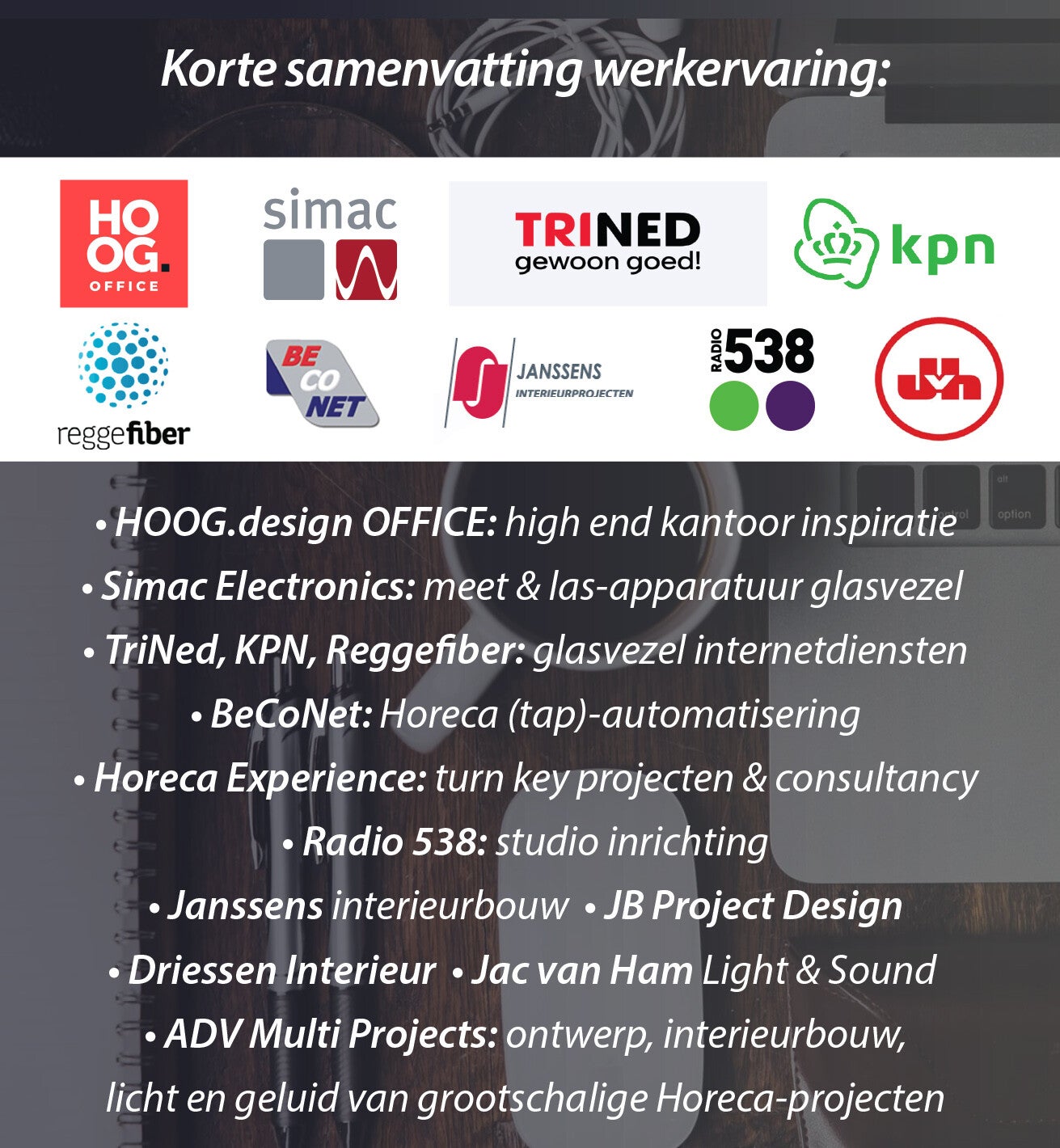 Een extraverte persoonlijkheid die zijn ervaring en klantbeleving graag deelt ten behoeve van een optimaal resultaat voor zowel opdrachtgever en de beoogde prospects/marktbenadering.